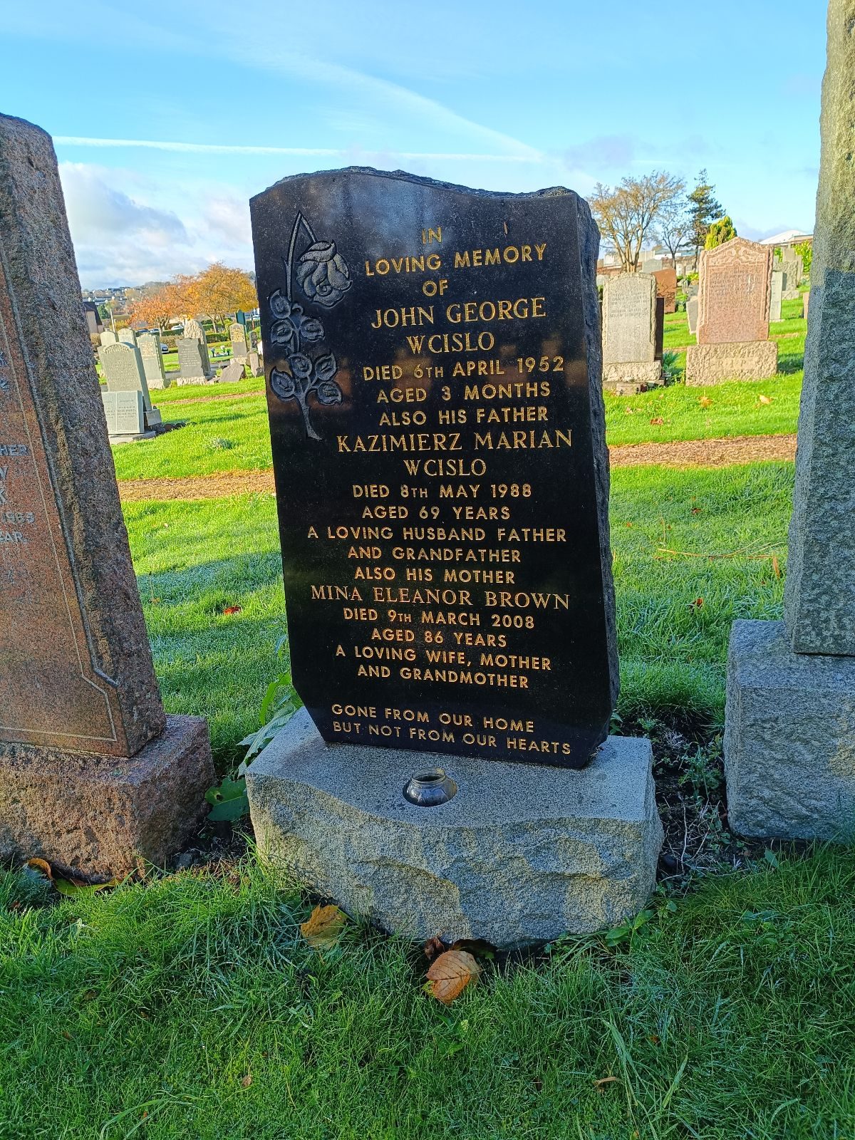 Kazimierz Marian Wcisło pochowany z synkiem Johnem George’m Wcislo, który żył 3 miesiące i zmarł 06.04.1952 r. oraz żoną Miną Eleanor Brown (1922? – 09.03.2008). |