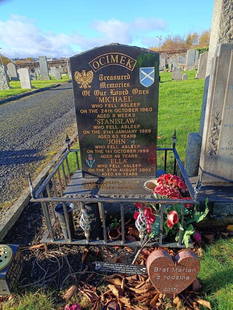 Pochowany z członkami rodziny Ocimek – Johnem (żył 8 tygodni, zm. 24.10.1960), Michaelem (1950? – 01.01.1999) i Ellą (1933? – 27.08.2002). |