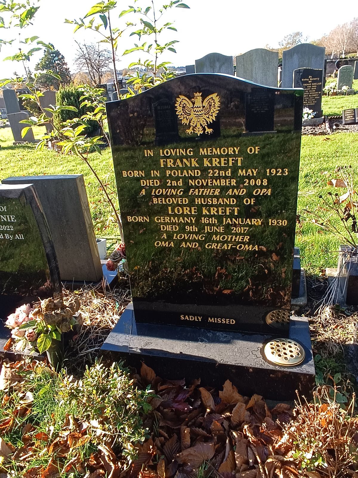 Pochowany z żoną Lore Kreft (16.01.1930, Niemcy – 09.06.2017). |