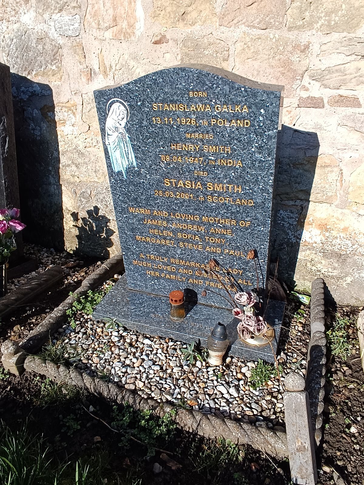 Urodzona w Polsce. Po wybuchu II wojny światowej wywieziona przez Sowietów na Sybir. Po uwolnieniu z niewoli sowieckiej służyła w polskich szpitalach w Szkocji. Tu też pozostała po zakończeniu wojny. 08.04.1947 r. w Indiach wyszła za mąż za Henry’ego Smitha. Aktywna w środowiskach polskich w Kirkcaldy. Miała dziewięcioro dzieci: Jamesa, Andrew, Anne, Helen, Sofię, Tony’ego, Margaret, Steve’a i Paula. |